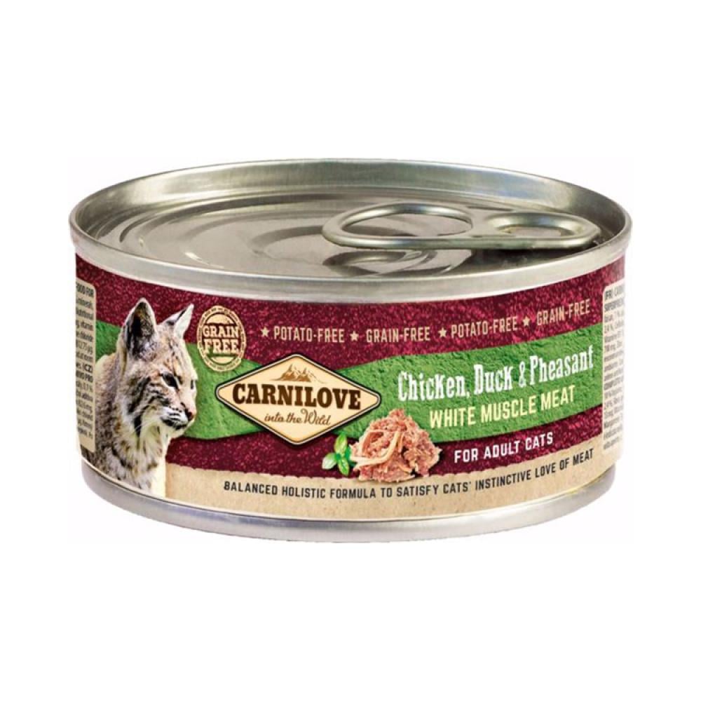 لحم كارنيلوف الأبيض العضلي من الدجاج والبط والدراج للقطط البالغة. طعام رطب كامل فائق الجودة للقطط البالغة.