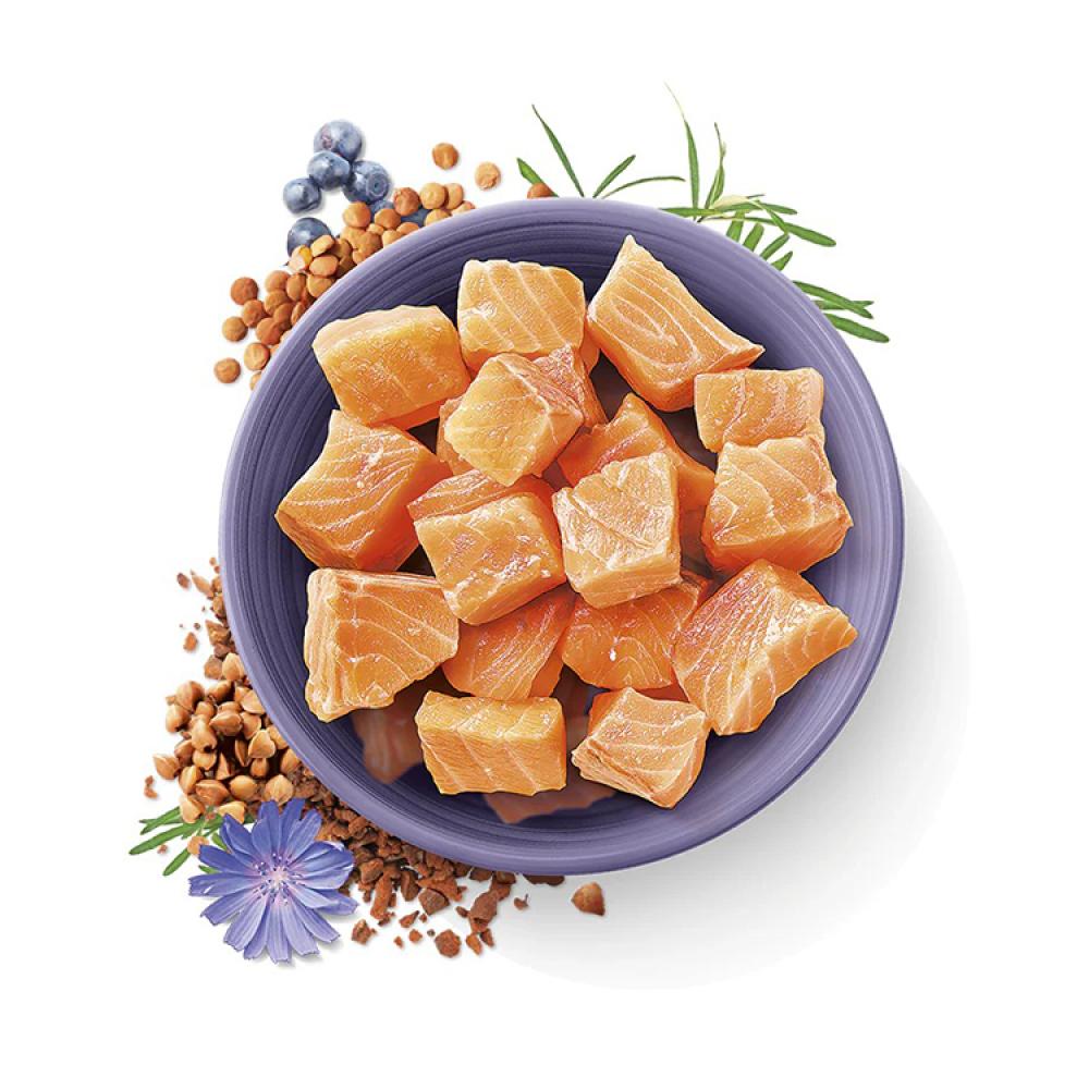 الأسماك الطازجة (70٪)، بروتين البازلاء، العدس الأحمر، الحنطة السوداء (4٪)، النكهات الطبيعية، دهن الدجاج، زيت السلمون (1٪)، كلوريد الصوديوم، كلوريد البوتاسيوم، عشب البحر المجفف (Ascophyllum nodosum، 0.5٪)، بروتين ليمنا (0.5٪)، دقيق البازلاء، نبق البحر المجفف (0.2٪)، جذر الزنجبيل المجفف (0.1٪)، التوت الأزرق المجفف (0.1٪)، إكليل الجبل المجفف (0.1٪)، التوت البري المجفف (0.1٪)، الزعتر المجفف (0.1٪)، خميرة البيرة (مصدر مانان-أوليجوساكاريد، 0.015٪)، جذور الهندباء (مصدر فركتو-أوليجوساكاريد، 0.015٪)، يوكا موهافي (0.008٪).