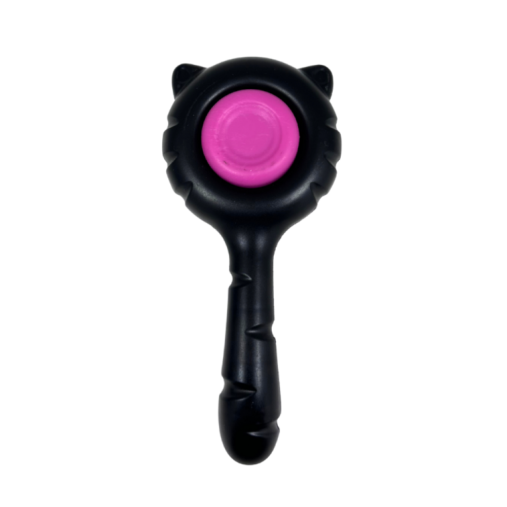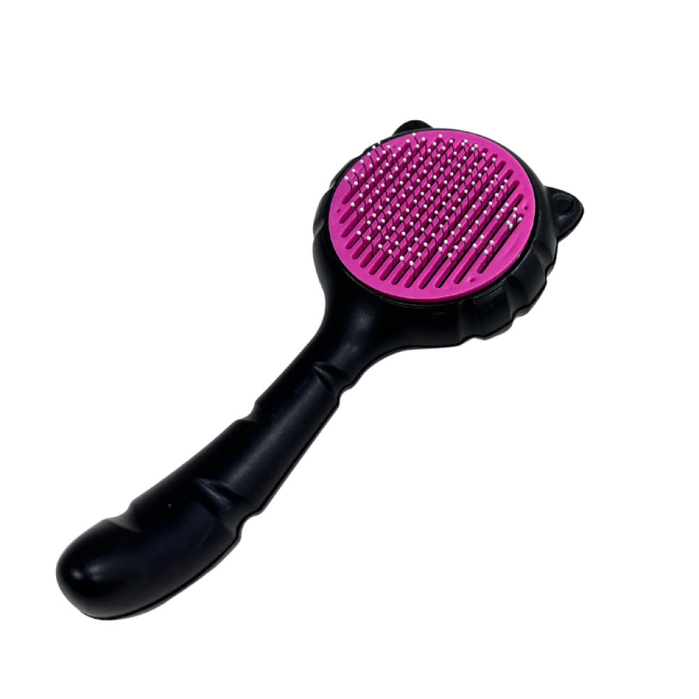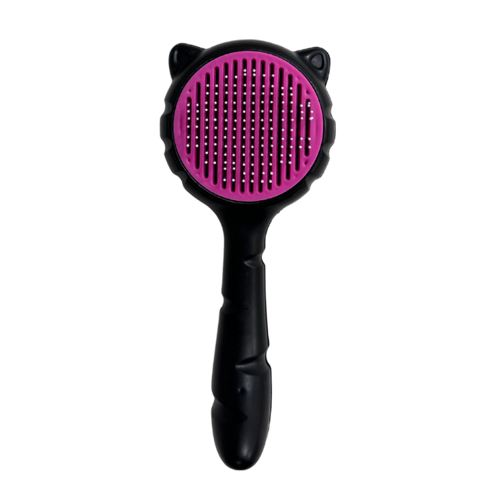 الفرشاة ذات مقبض أسود مريح يسهل الإمساك به، ويوفر تحكمًا جيدًا أثناء التمشيط. الجزء العلوي من الفرشاة، الذي يحتوي على الشعيرات، مصمم بشكل دائري ومحاط بإطار على شكل أذني قطة، مما يضيف لمسة جمالية ومرحة