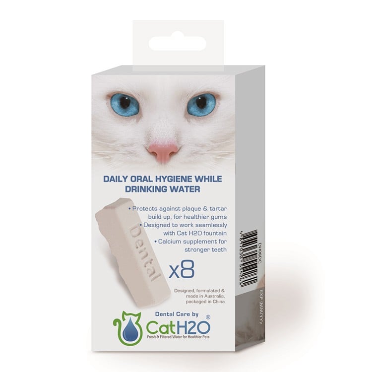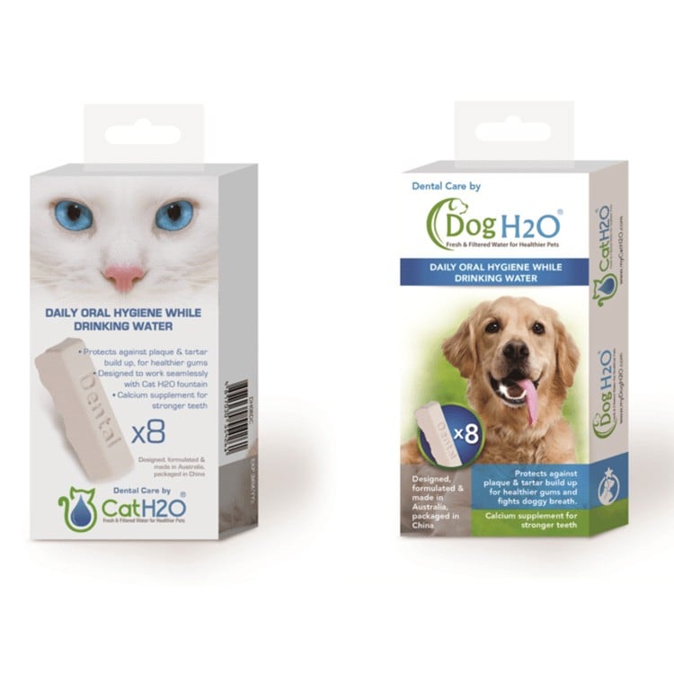 أقراص DogH2O و CatH2O للعناية بالأسنان للحيوانات الأليفة. توفر هذه الأقراص العناية اليومية بالأسنان لأصدقائك الفرويين فقط من خلال شرب الماء، حيث تحارب رائحة الفم السيئة وتحمي بشكل فعال ضد الجير والتكلس، لثة أكثر صحة.