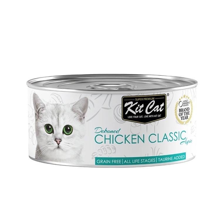 أطعمة القطط المعلبة الخالية من الحبوب من كيت كات منزوعة العظم بالدجاج، هي طعام تكميلي مناسب للقطط من جميع الأعمار.