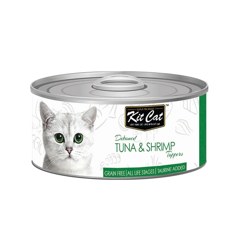 أطعمة القطط المعلبة الخالية من الحبوب من كيت كات منزوعة العظم بالتونة والروبيان، هي طعام تكميلي مناسب للقطط من جميع الأعمار.