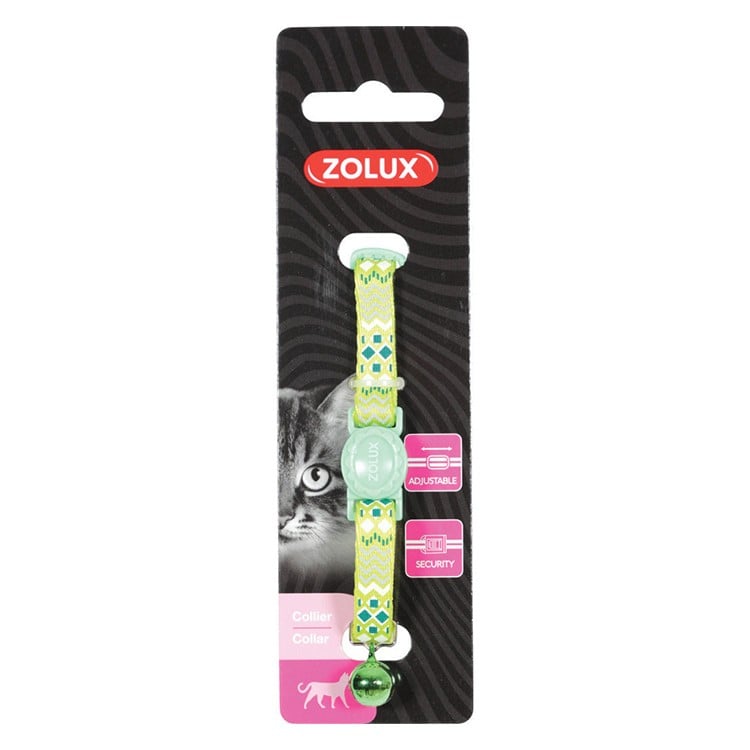 طوق عنق للقطط باللون الأخضر المبهج , مصنوع من النايلون مع نقشة مميزة، من ماركة زولكس الشهيرة، يمتاز بمظهر رائع ليزين قططك ويزيدها جمالا ، مُصنع من مواد آمنة على صحة القطط المنزلية والحيوانات الأليفة الأخرى، ويمكنك استخدامه بكل أمان وسهولة.