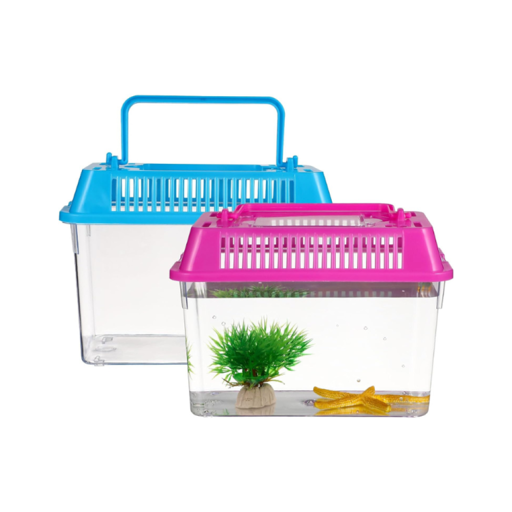 - أحواض للأسماك مزودة بغطاء بفتحات تهوية ومقبض عملي يسهل النقل.