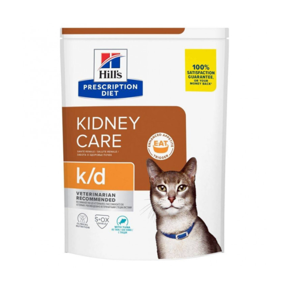 Hill’s Prescription Diet k/d Cat Food with Tuna is formulated to support kidney function in cats suffering from chronic or temporary kidney insufficiency. This food contains a low level of phosphorus and a limited but high-quality protein content.