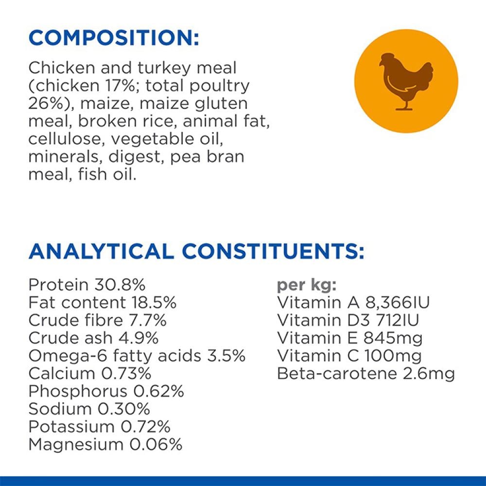 Chicken and turkey meal (chicken 17%, total poultry 26%), corn, corn gluten meal, broken rice, animal fat, cellulose, vegetable oils, minerals, hydrolyzed protein, pea bran meal, fish oil.