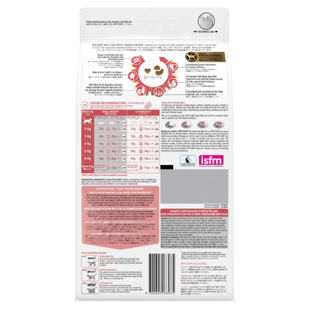 Pro Plan Adult Cat Food "Face & Beauty" Salmon provides all the nutrition your cat needs, plus extra nutrients to maintain healthy, beautiful skin and delicate coat, and a great taste and texture that even picky cats will love.
