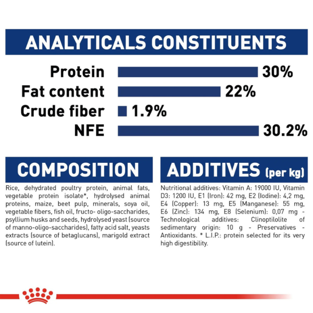 Rice, dried poultry protein, animal fats, isolated plant protein*, hydrolyzed animal proteins, corn, beet pulp, minerals, soybean oil, plant fibers, fish oil, low-fructose sugars, psyllium husks and seeds, hydrolyzed yeast (source of low-mannan sugars), fatty acid salts, yeast extracts (source of beta-glucans), marigold extract (source of lutein).